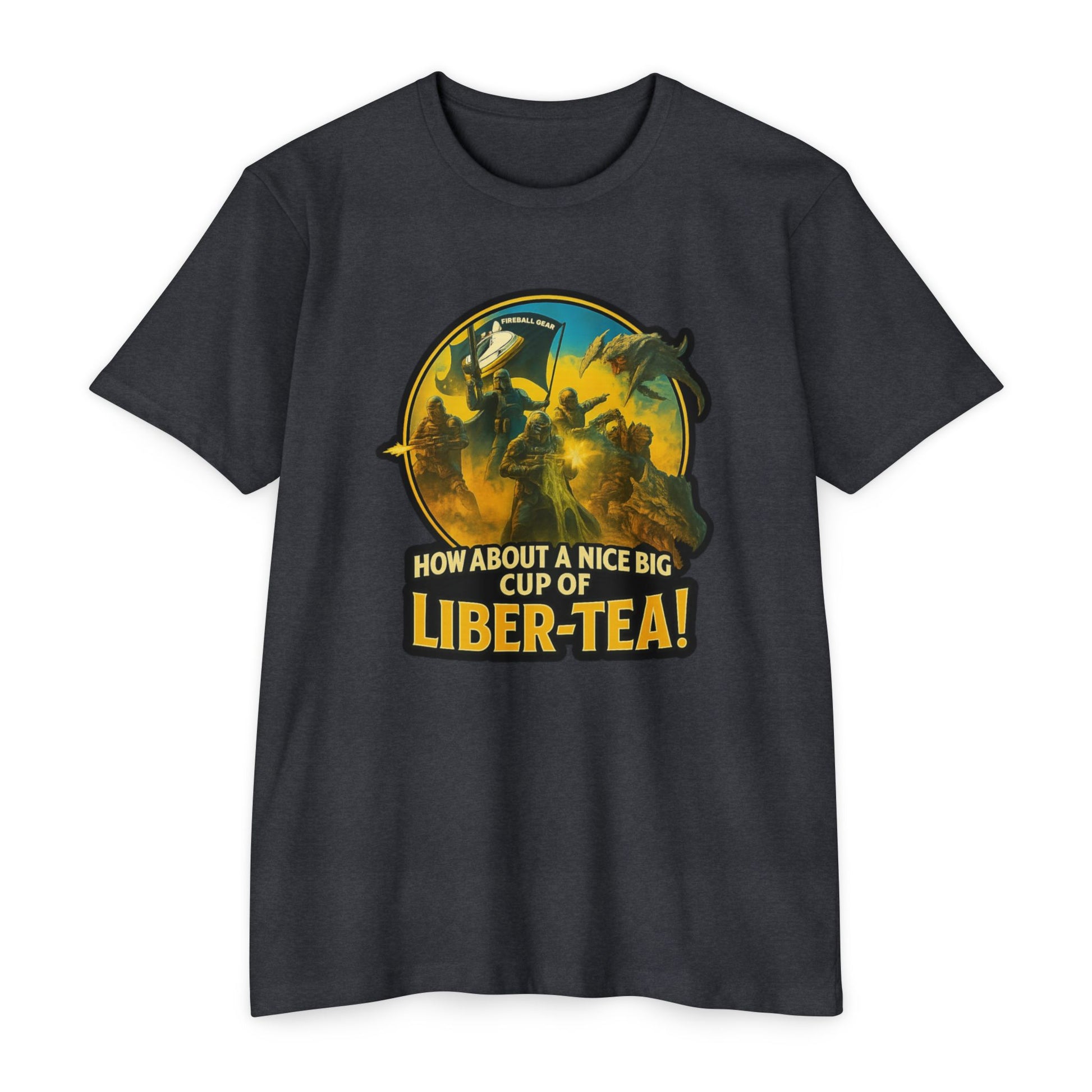 Pour yourself a nice big cup of LIBRA-TEA with this Fireball Gear Hell Divers themed gaming tee—soft CVC cotton built for comfort and chaos.